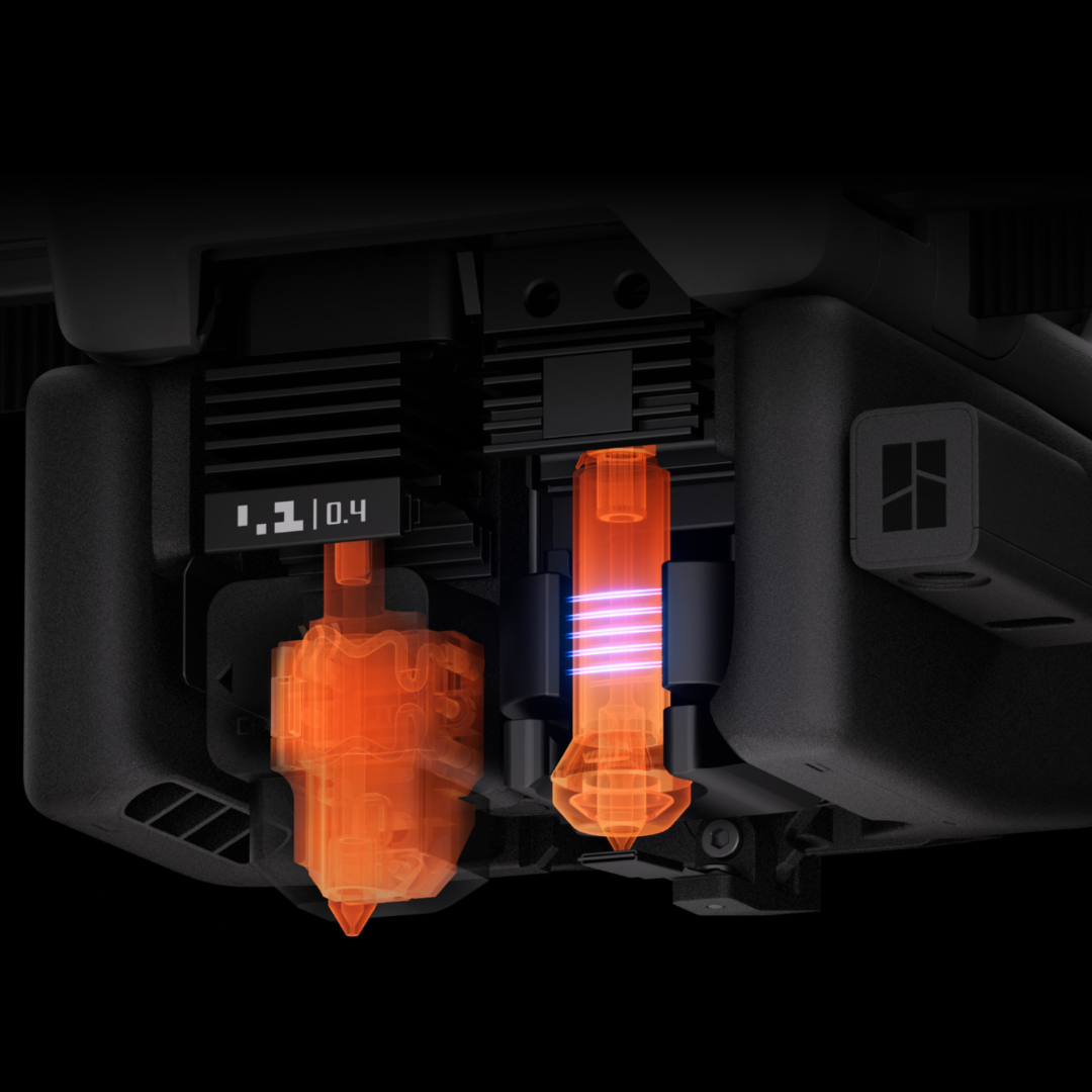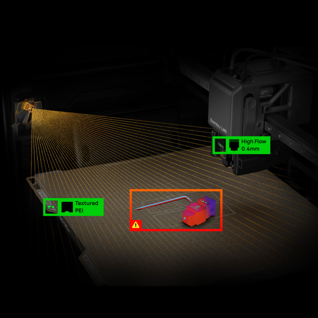The H2C features an AI-backed camera system. This intelligent monitoring system continuously tracks extrusion patterns, immediately detecting material accumulation, filament deviations, and extrusion failures. Also runs a pre-flight scan to ensure a safe start.