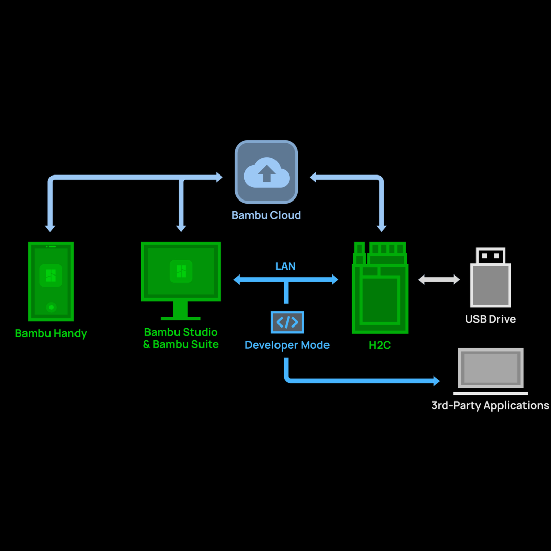 The H2C offers convenient cloud connectivity for remote control from any device. For security-sensitive applications, it also provides full offline functionality, ensuring complete physical isolation. Users can operate the printer, send files, and update firmware without an internet connection. For advanced users, Developer Mode enables MQTT port access for integrating third-party components and software.*