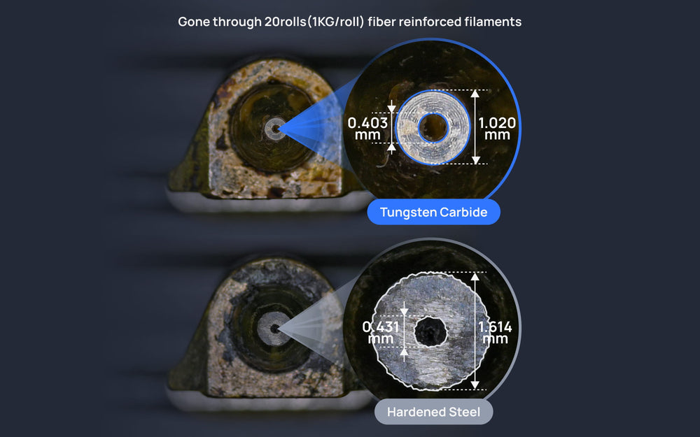 With HRA 90 compared to hardened steel's 74, the H2D Pro's tungsten carbide nozzle provides exceptional wear resistance. This results in a 50% increase in lifespan when printing abrasive, high-performance fiber-reinforced filaments.