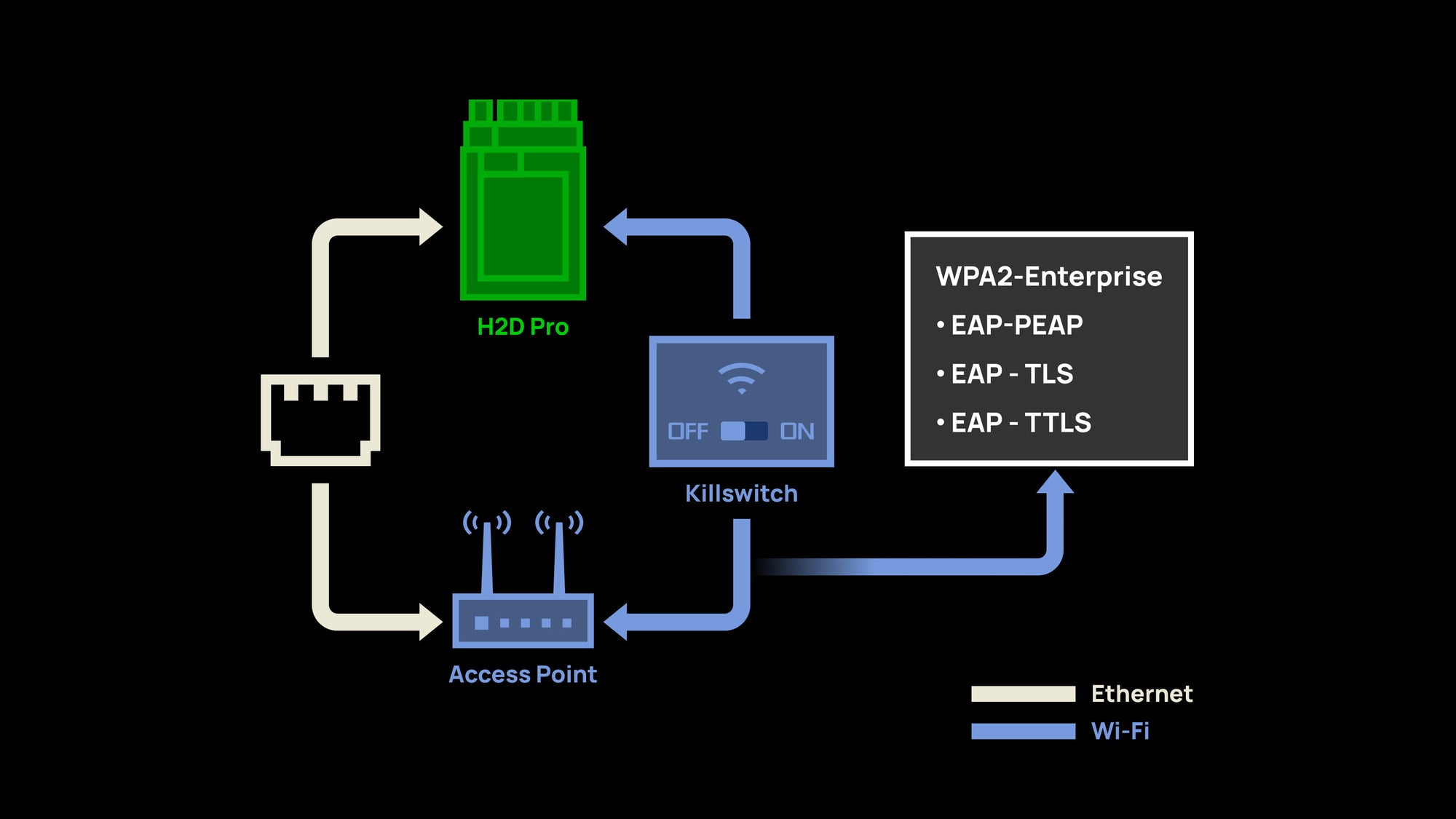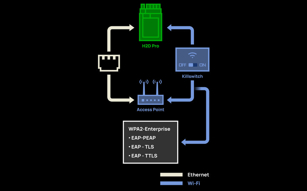 The H2D Pro offers the option to connect to your devices through its newly added Ethernet port, ensuring robust network communication in complex environments. Ethernet connectivity can also be used in crowded wireless signal environments. Additionally, the H2D Pro provides WPA2-Enterprise Wi-Fi Authentication (EAP-PEAP/EAP-TLS/EAP-TTLS) and individual physical kill switches for Wi-Fi, meeting stringent network security requirements.