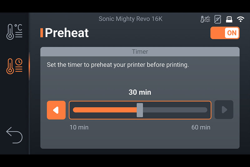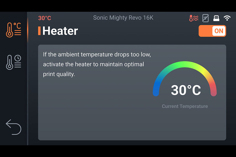 Revo 16K’s built-in heater warms up in just 30 minutes, holding the printer chamber steady at 30°C so your prints stay flawless even with sudden temperature swings.