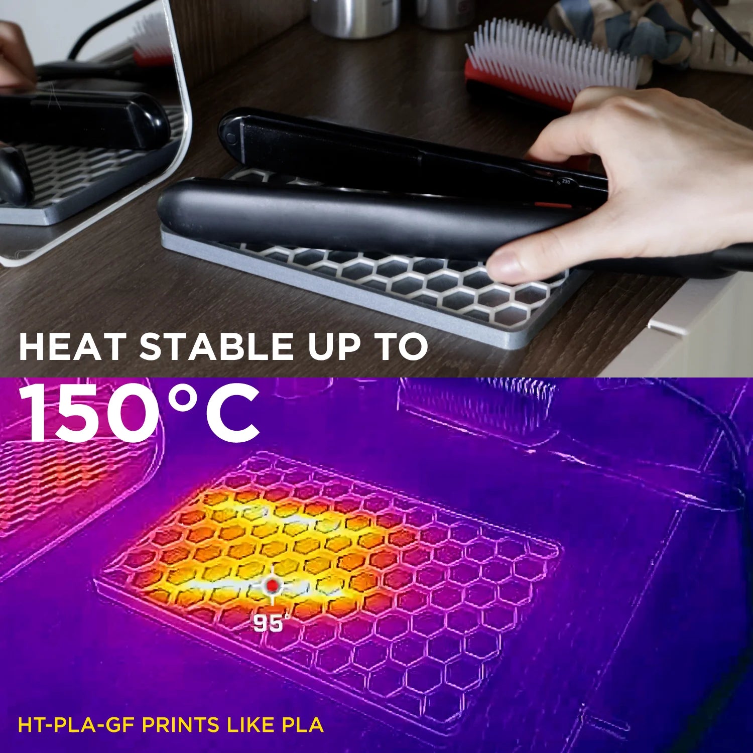 Printing Requirements: Due to the abrasive nature of glass fiber reinforcement, HT-PLA-GF requires a hardened steel or ruby nozzle for optimal results and extended printer life. The material maintains compatibility with standard FDM printers using regular PLA settings, though the specialized nozzle is essential for consistent performance and preventing premature wear.